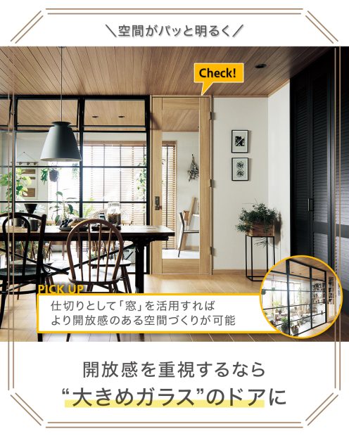 住まいのスペースが限られてしまうことも多い昨今、“視線の抜け”は空間演出の重要なポイントです。たとえば、採光部の大きい“大きめガラス”のドアを取り入れれば光と視線が通り、より開放感のある空間に仕上がります。