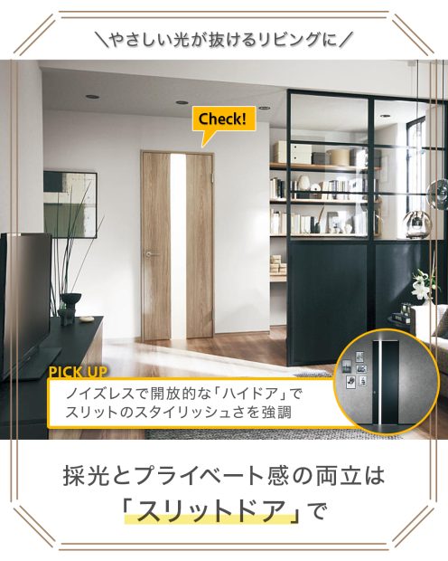 「ベリティス」の内装ドアなら、スリット入りのドアデザインも豊富にラインアップ。垂れ壁のないハイドアタイプが揃った「プラスレーベル」なら、よりスタイリッシュで洗練された印象を演出できます。