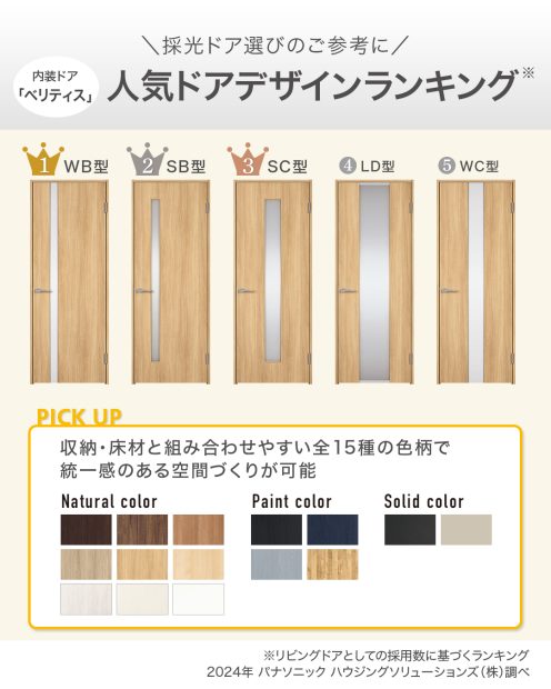 採光ドアのデザインが豊富なパナソニックの「ベリティス」は、それぞれのデザインと全15種類の色柄を組み合わせて、お好みのドアがつくれます。収納や建具ともコーディネイトがしやすいので、統一感のある空間づくりが可能です。