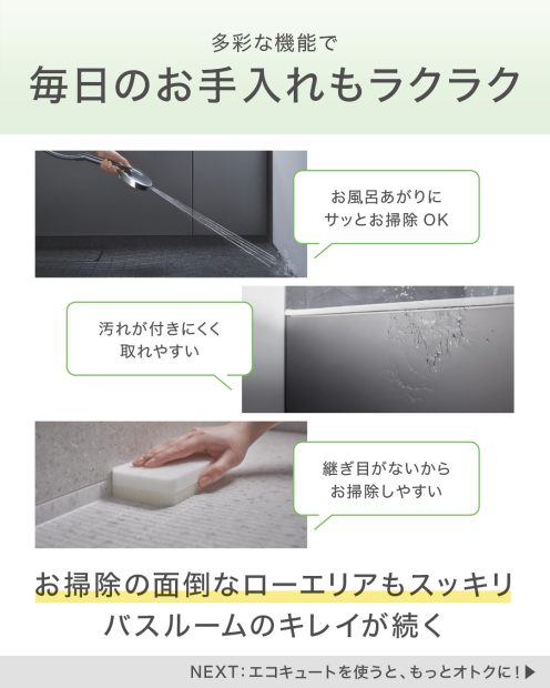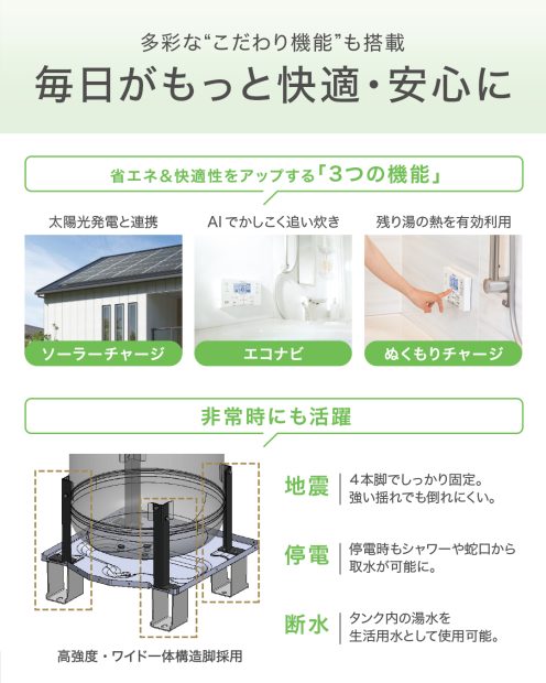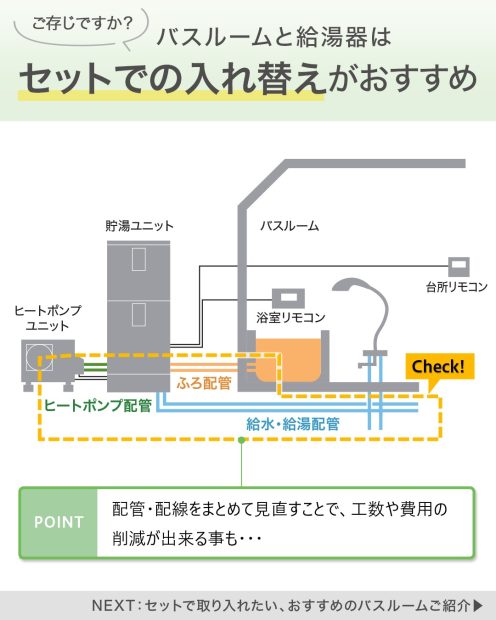 お風呂のリフォームとあわせて、給湯器を省エネタイプのエコキュートなどへ交換する “いっしょ替え” もおすすめです。