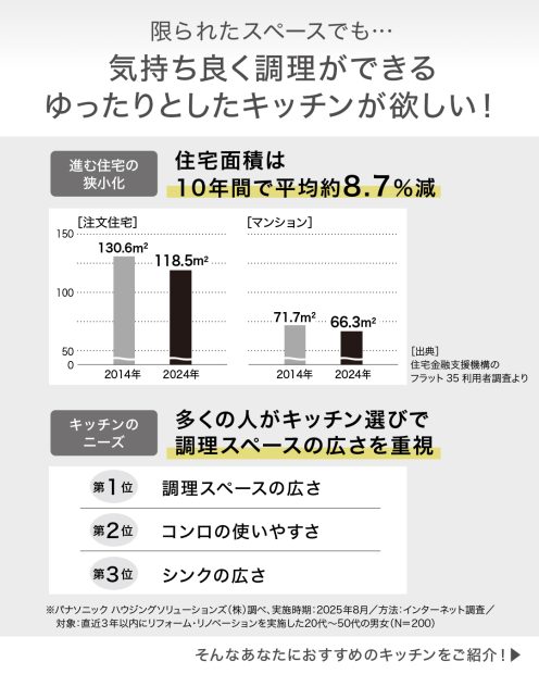 しかし、パナソニックハウジングソリューションズ(株)が実施したアンケートによると、キッチンにおいて多くの人が「調理スペースの広さ」を重視しているという結果に。せっかくリフォームするなら、キッチンの快適さもしっかりアップさせたいですよね。