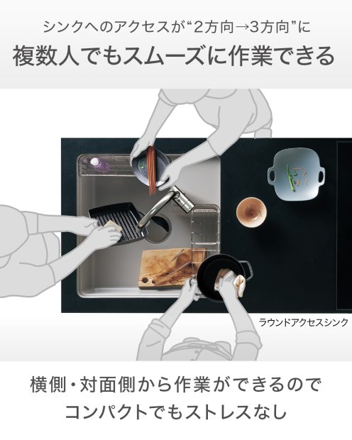 省スペースでも設置がしやすい上、3方向からシンクが使える「ラウンドアクセスシンク」、