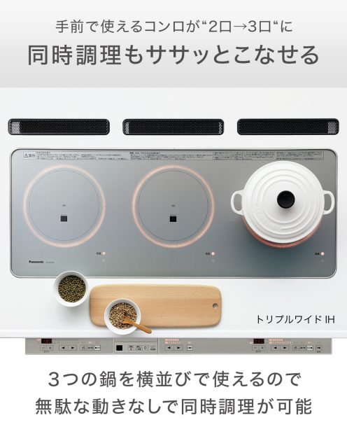 3つの鍋を横並びで使えて同時調理がしやすい「フラットワイドコンロ」など、高機能の設備を多数搭載。