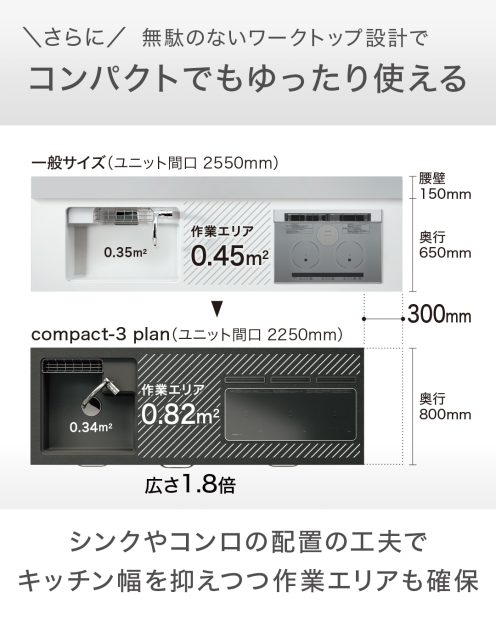 さらに、無駄のないワークトップ設計で、一般的なキッチンよりも横幅を抑えながら広々とした作業スペースを実現。