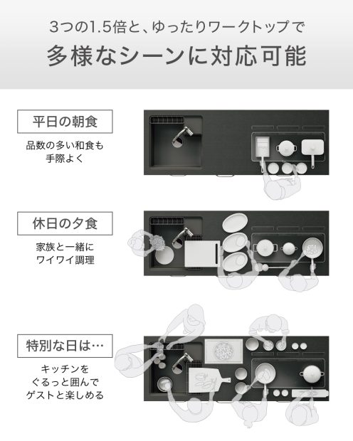 高機能と広々としたワークトップで、多様な生活シーンに対応できます。