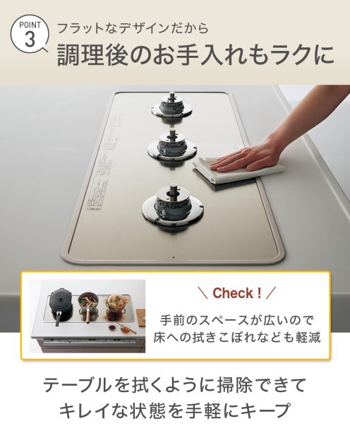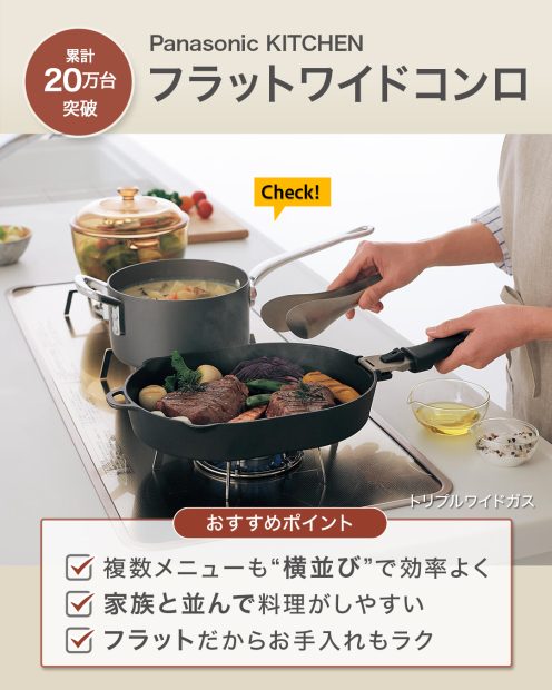 家事の時短・効率化には、横並びの3口コンロが特長の「フラットワイドコンロシリーズ 」がおすすめです。