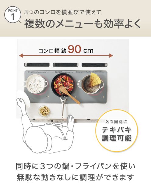 お鍋やフライパンを3つ並べられるので、3口をフル稼働させて複数のメニューを同時に調理可能。