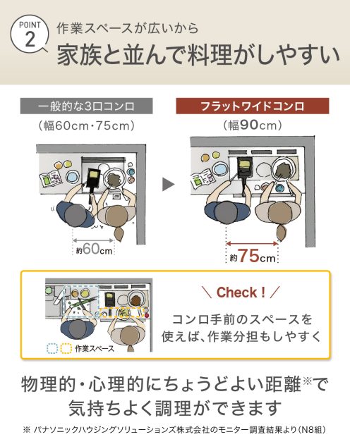 見た目以上に作業スペースが広いため、家族と並んでのお料理もしやすく、フラットな設計なので調理後のお手入れもカンタン。